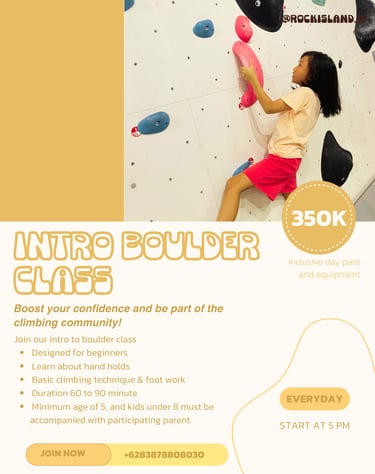 Our Intro to Boulder Class is made for beginners to learn proper climbing techniques, footwork, and safe falling — all in a fun and supportive environment.